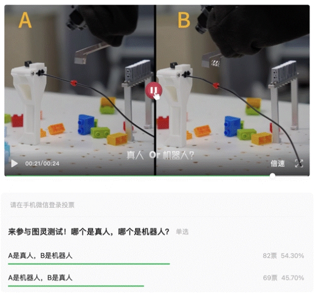 在他们发布的一次线束装配「图灵测试」中,超过50%的投票者都分不清到底哪个才是机器人,误把选项A认作真人。