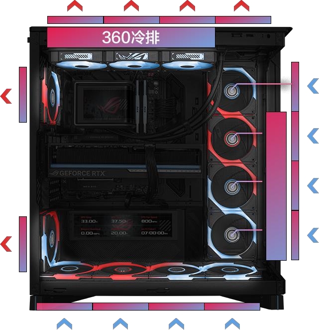 在性能层面,ROG幻世神海景房机箱具备高散热与高扩展。其至多支持14颗120mm风扇安装,并兼容2组360mm规格水冷排,能够满足风冷及水冷等多种散热方案需求,为高性能硬件提供稳定的温控支持。还支持最高180mm高度的风冷散热器,并通过底部进风结构提升整体气流效率。配合可旋转式风扇支架设计,玩家可根据硬件布局灵活调整风道方向,进一步优化内部散热环境。在扩展方面,该机箱兼容新一代BTF主板设计,有助于优化线材布局,使整机内部更加整洁。与此同时,机箱前置接口配备双20Gbps Type-C接口,并支持PD快充功能,在数据传输与设备供电方面提供更高效率,满足日常使用与外设连接需求。