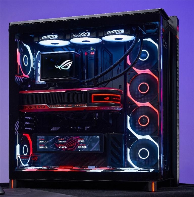 在交互设计方面,ROG幻世神海景房机箱搭载一块9.2英寸LCD屏幕模组,为机箱赋予更多个性化空间与实用功能。该屏幕支持系统参数监控与系统时钟显示,玩家可实时查看主机运行状态,包括温度、负载等关键数据,使整机运行情况更加直观清晰。此外,该屏幕还支持提醒功能,可根据预设时间或日期进行提示,在日常使用中提升实用性表现。屏幕模组支持0°至45°旋转,无需借助工具或额外配件,即可完成位置调整,满足不同摆放环境下的观看需求。配合ASUS CYBERVIEW专属控制软件,玩家还可对显示内容进行自定义设置,实现界面风格、信息显示等多维度调节,从而打造更具个性化特征的主机外观。