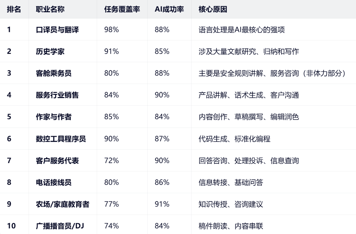 微软研究院(Microsoft Research)在2025年7月发布的一项重磅学术研究,Working with AI: Measuring the Occupational Implications of Generative AI(与AI共事:衡量生成式AI的职业影响)。这份报告之所以在业内引起巨大轰动,是因为它不同于以往仅靠“理论推测”的研究,而是基于20万条真实的Bing Copilot用户对话数据,分析了AI到底在实际工作中被用来做什么,从而得出了“AI适用性分数”。从下表中10个最容易被AI取代的职业可以看出,口译员和翻译名列榜首。
