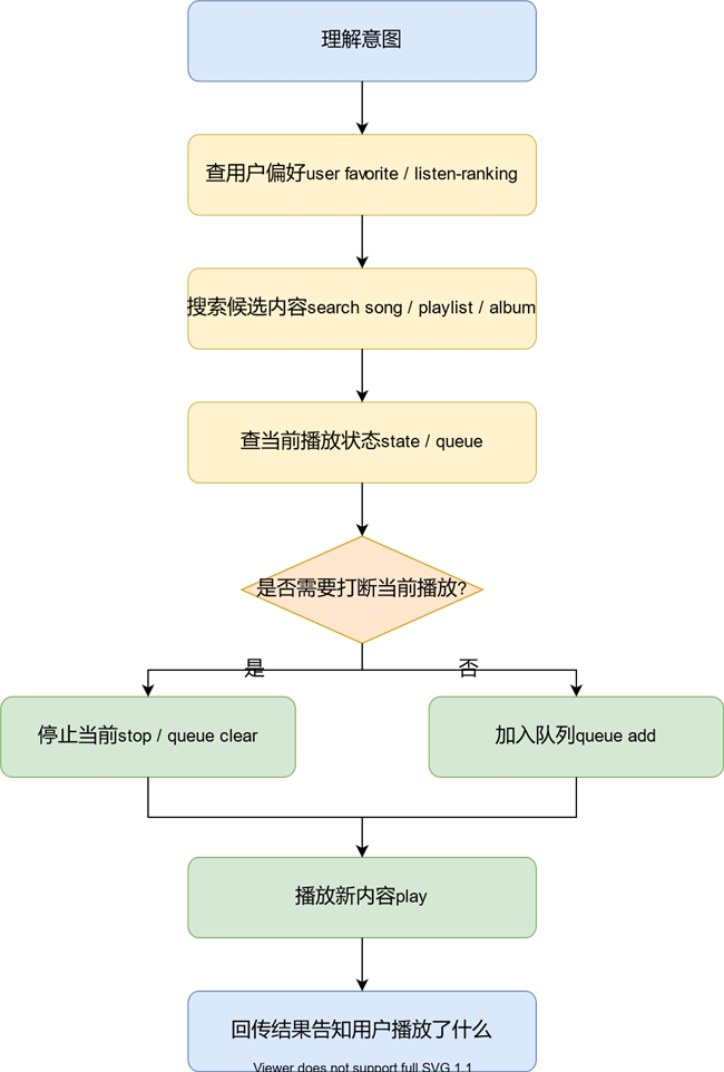 AI 处理一个请求,本质上是一个多步推理 + 执行的过程。以「帮我播放一首适合现在心情的歌」为例,AI 需要能做这些事: