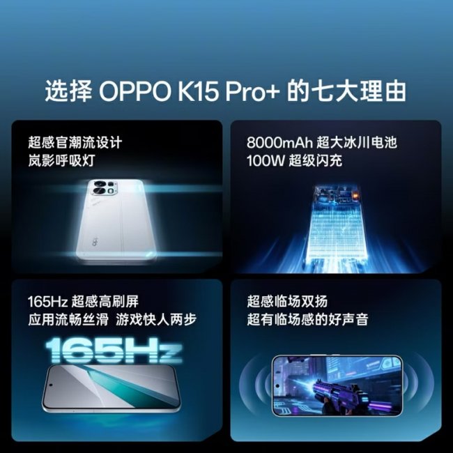 屏幕与续航方面,OPPO K15 Pro系列同样实现全面升级。OPPO K15 Pro配备6.59英寸黄金尺寸小直屏,144Hz超感高刷屏,是行业罕见的小屏风扇手机;OPPO K15 Pro+则配备6.78英寸1.5K LTPS直屏,日常使用与游戏视觉体验拉满。续航方面,OPPO K15 Pro搭载7500mAh冰川电池,支持80W超级闪充;OPPO K15 Pro+升级为8000mAh冰川电池,搭配100W超级闪充,全系首发自研冰川电池聚能芯片,20%低电仍能满血流畅运行,彻底告别低电量焦虑。