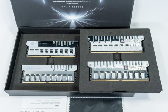 包装内部划分为三个区域:分别用于放置随附风扇、配件以及内存本体。由于该套装为四条装(4-DIMM),因此共分为两组,每条内存均嵌置于泡棉中。此类结构不仅在运输与搬运过程中提供良好的防护,也进一步强化了产品的高端定位。