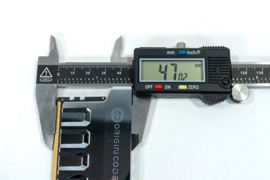 经卡尺实测,ORIGIN CODE Vortex DDR5-6000 的 Z 轴高度为 47 mm。单条重量约为 91 克,在我们目前评测过的内存套装中属于最重级别。