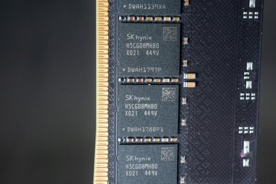 拆除散热片后,可以观察到多个值得关注的细节。首先,CNC铣削铝制散热片表现尤为突出,相较于多数 DDR5 产品常见的冲压薄铝片,其用料更加扎实,整体质感与重量均明显提升。导热设计方面同样值得关注。内存颗粒正反两面均覆盖厚度为 1 mm、具备较高导热系数(W/mK)的导热胶;同时,PCB 上方还额外配置了 1.5 mm 厚的导热垫,以增强热量向散热片的传导效率,从而提升整体散热能力。该套装亦对 PMIC(电源管理芯片)提供了导热覆盖。在颗粒配置方面,该内存采用双面布局设计,每面搭载 8 颗 24 Gbit(3 GB)容量的存储颗粒。这一配置符合当前 DDR5 48 GB 单条容量的主流实现方式,体现了 DDR5 代际在存储密度上的持续提升。