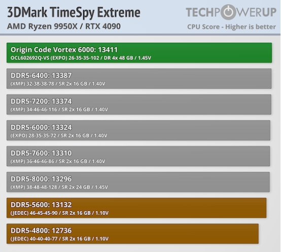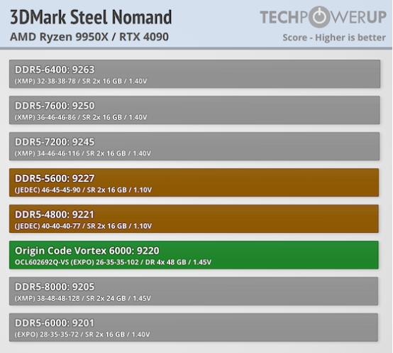 在游戏性能方面,DDR5-6000 对于 AMD Zen 4 与 Zen 5 处理器而言确实处于“甜品频率”,是与其搭配的理想选择。通过本次全面的基准测试,我们也较为清晰地展示了该内存套装在实际使用中的表现预期。在原始带宽方面,这种四条 DIMM 的配置已将 DDR5-6000 的性能推至当前的极限。然而,在实际应用中,其表现会受到一定延迟因素的制约,这主要源于内存颗粒从 16 Gbit 向 24 Gbit 密度提升后,tRFC 等关键时序参数的增加。简单来说,更高密度的内存通常意味着更高的默认延迟。此外,多 Rank 结构还会增加内存控制器的调度负担,需要在运行过程中进行动态交错处理,这也会带来额外负担,对性能产生一定影响。尽管存在上述挑战,在大多数游戏与理论基准测试中,ORIGIN CODE Vortex DDR5-6000 CL26(4×48 GB)内存套装的表现依然能够与更小容量的DDR5-6000 CL28 32 GB(2 ×16GB)内存套装持平,这一结果在同级产品中已属相当出色。