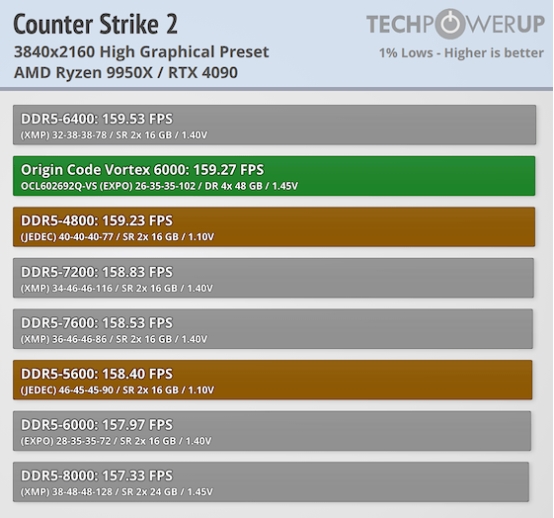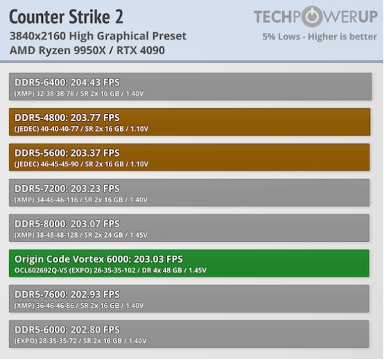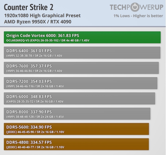 在《反恐精英2》这类高度依赖高帧率与快速响应的游戏中,内存性能对游戏竞技体验至关重要。在与另一款大容量内存套装的直接对比中,ORIGIN CODE Vortex DDR5-6000 192 GB(CL26)在性能上能够与 DDR5-6000 96 GB(CL28)方案展开有力竞争。针对 AMD Ryzen 7000 与 9000 系列处理器,其最佳内存频率通常位于 6000 MT/s 至 6400 MT/s 区间,即业内常称的“甜品频率(Sweet Spot)”。本次评测的内存套装均处于该最佳区间内,能够充分释放处理器的性能潜力。在时序调校方面,ORIGIN CODE Vortex 套装通过优化主时序,实现了更低的延迟表现,从而在一定程度上抵消了大容量内存在部分场景下的劣势,使整体性能表现更加均衡。