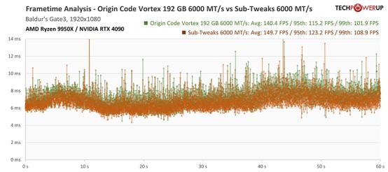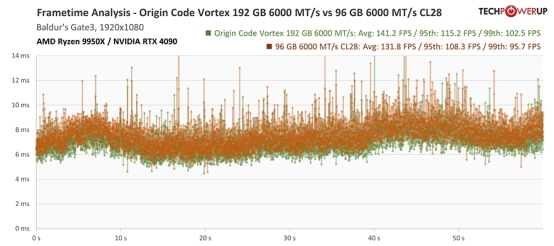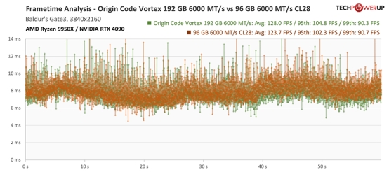 在 4K 游戏场景下,系统性能已基本不再受限于内存选择。尽管如此,在 99% 与 95% 分位帧率指标上,仍可能因内存频率与延迟差异出现轻微波动,但整体幅度均处于误差范围之内。 AMD Ryzen 9950X 帧时间分析:《博德之门 3》