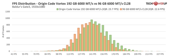 《博德之门 3》是一款同时受益于高频率与低延迟的游戏,ORIGIN CODE Vortex DDR5-6000 192 GB 内存搭配 NVIDIA RTX 4090 时,其性能表现与 6400 CL32 基本处于误差范围内,同时明显优于对比的 96 GB 套装。与《反恐精英 2》的测试结果类似,ORIGIN CODE Vortex 套装整体性能表现更加均衡且稳定。
