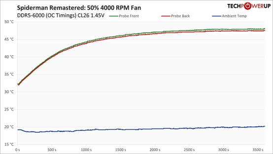接下来展示的是在实际游戏场景下的温度表现,此时系统应用了中等强度的内存超频,重点优化子时序,而非单纯追求更高频率。关于该超频设置的更多细节,将在后续章节中说明。在此需要关注的是,该图主要反映了经过内存调校后的超频状态在游戏环境中的热表现。测试中我们选择将风扇转速固定在 50%,因为在系统负载状态下,其噪音不会超过整机及显卡风扇。结果显示,其温度相比压力测试降低约 13°C,并最终趋于稳定。