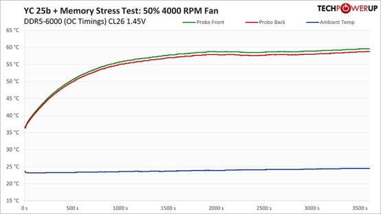 最后一张图同样基于上述中等强度超频设置,依然以子时序优化为核心。在该测试中,我们采用了评测中一贯使用的 Y-Cruncher 稳定性验证流程进行温度记录:首先运行 y-cruncher,随后紧接着使用内存压力测试软件 Karhu 进行为期一小时的稳定性测试。该流程可确保内存超频在典型使用场景下具备良好的稳定性。在风扇转速设定为 50%(约 2500 RPM)的情况下,其热表现与未超频时的初始风扇测试结果非常接近。这表明,在开启散热模块并以 50% 转速运行时,即使在 DDR5-6000 的 XMP/EXPO 配置与 1.45 V 电压的“极限负载”条件下,DRAM 峰值温度依然可稳定控制在 60°C 出头的水平。 AMD内存超频