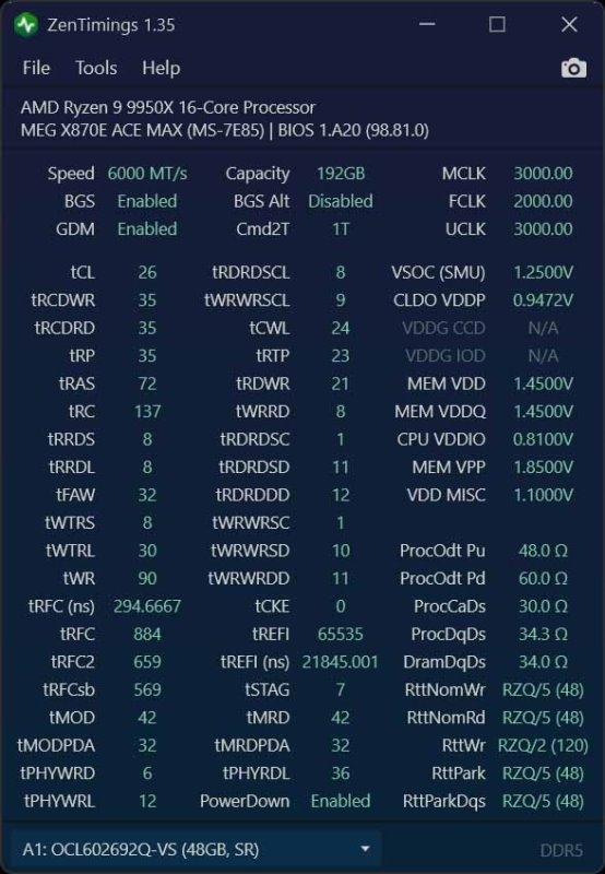 内存(1):ORIGIN CODE Vortex DDR5-6000 OCL602692Q-VS(26-35-35-102-137)(EXPO)- FCLK 2000 MHz - 1:1 比例