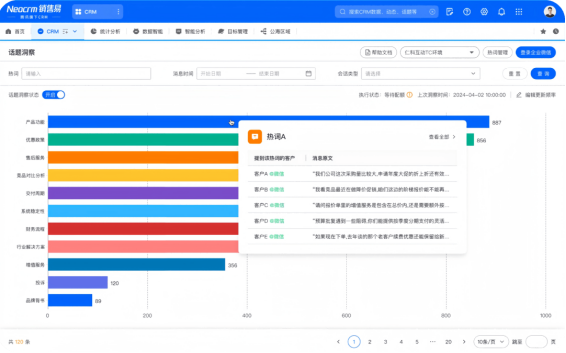 Agent能够智能洞察出客户聊天中的热点话题,精准推送营销素材,并为意向客户智能打上标签、补全画像。