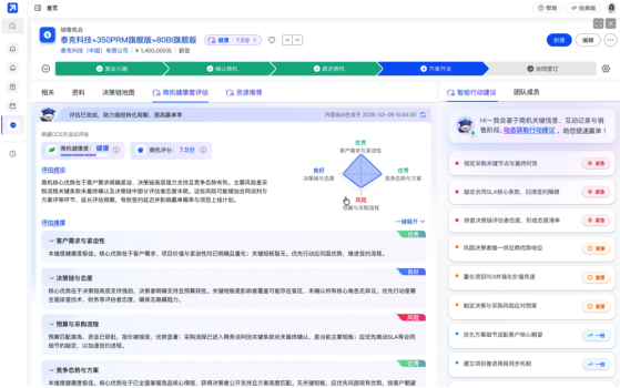 Agent整合了内外部数据资产,输出结构化、可解释、可行动的商机健康度评估,帮助销售扫清商机风险盲点、聚焦高潜机会。