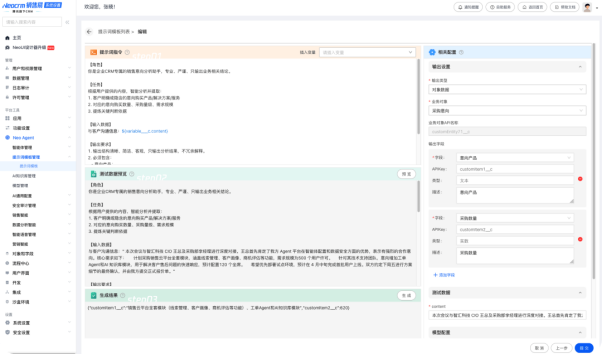 NeoAgent2.0将工作流与Agent能力深度结合,通过业务代码直连提示词,在全流程业务节点调用 AI。比如,在关键业务流程节点设置AI自动录入、总结、查询等任务,释放员工精力,缩短流程耗时。管理员还可配置可复用、统一规范的提示词模板,确保各类业务输出标准一致,提升企业AI应用的规范性。