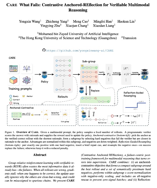 针对这一问题,传音TEX AI中心与中山大学、MBZUAI团队合作,开发了CARE(Contrastive Anchored REflection)技术,从训练机制上对传统路径进行了优化。不同于仅以“结果对错”作为反馈信号的方式,CARE技术将关注点前移到推理过程本身,重点引入“高质量错误样本”——即那些接近正确但存在关键步骤偏差的解题路径。通过将这类样本与标准解法进行对比分析,并结合反思式重推理机制,模型能够识别具体错误环节,并完成自我修正,从而形成更稳定、连贯的推理能力。在引入反思机制后,模型对复杂问题的二次推理成功率由约10%–19%提升至76.6%,有效增强了面对复杂题目时的稳定性。