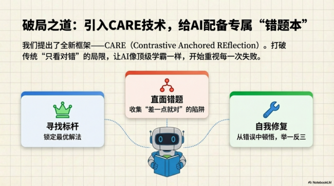 此外,CARE技术还引入“救援机制”:即使多次尝试均未得到正确结果,系统仍会从已有错误路径中筛选出“相对最优解”,作为进一步学习的起点,使模型在复杂问题下仍能持续优化推理能力。