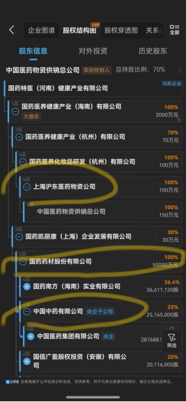 4. 第四层(国药药材股权追溯):国药药材股份有限公司的股东结构中,中国中药有限公司持股25%,为其重要参股主体;