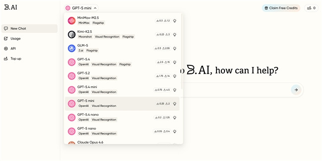 目前,B.AI已支持包括 ChatGPT、Claude、Gemini 等全球顶尖 AI 大模型,以及 MiniMax、Kimi、GLM 等国内性价比优异的模型,用户可在单一页面对话不同模型。在 API 调用方面,则提供统一的API Key服务接口,用户只需创建一个 B.AI API Key,即可一站式调用所有集成模型的 API,省去向不同服务商重复申请、管理多套 API 的繁琐流程。