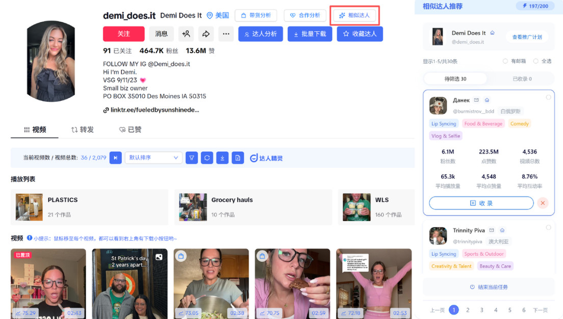 找达人怕踩坑?达人精灵插件支持一键透视全景画像、达人带货数据、AI评估合作价值,帮你找到能带货的优质达人,更有【找相似达人】一键获取相似达人清单,高效拓展达人资源池;一键批量建联,单日触达20000+,提效200%+。同时,结合「达人黑名单」,帮你提前规避风险;