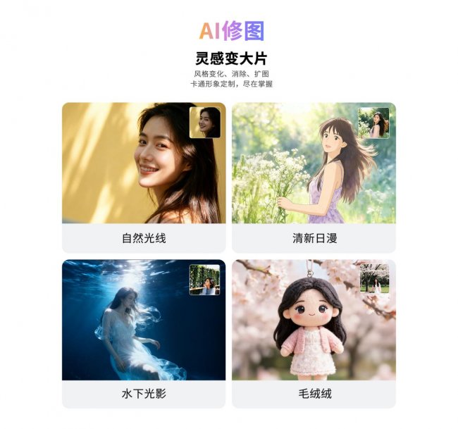 4、AI修图:支持一键消除路人、图片连续处理、一句话创意修图,无需第三方软件即可完成照片个性化创作。