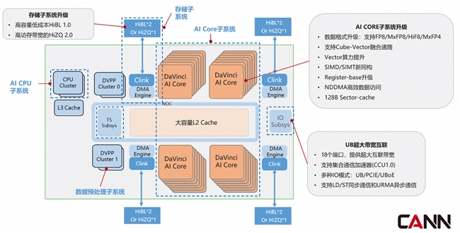 ● 张量-向量协同计算:单核内Cube核(张量计算)峰值算力与上一代持平,Vector核(向量计算)FP16/FP32性能翻倍,二者通过高速直连通道实现数据无缝流转,彻底解决传统AI芯片在混合计算(如FA)任务中的瓶颈问题。