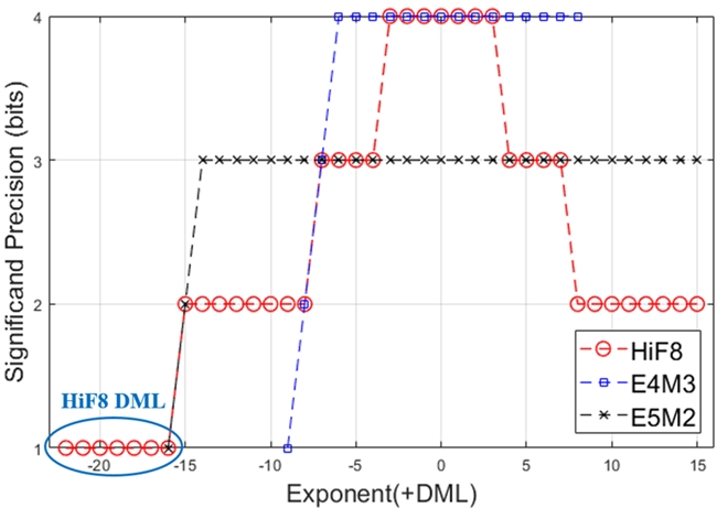 ● HiF8/FP8/MXFP8/MXFP4:支持MXFP8/4和FP8基础上,全新设计了动态位宽浮点格式HiF8,在保证精度的同时大幅降低存储与带宽需求。以HiF8为例,其采用变长前缀编码+原码阶码优化,动态范围接近FP16(-22∼15),但计算效率提升2~4倍,尤其适合LLM训练与推理。