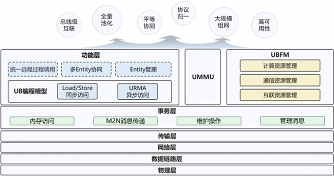 灵衢互联提供分层的协议栈结构,从下到上由物理层、数据链路层、网络层、传输层、事务层、功能层以及UMMU、UBFM(UB Fabric Manager)组成,如下图所示。其中,Entity为功能实体,是全局通信的基本单元;URMA(Unified Remote Memory Access)为统一远程内存访问。