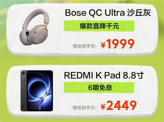 旅途路上,沉浸式影音娱乐是舒缓身心、丰富时光的绝佳方式。Bose QC Ultra头戴式耳机搭载旗舰级主动降噪技术,可有效隔绝旅途环境噪音,带来纯净听觉享受,无论是聆听音乐、观看影视,还是畅享游戏音效,都能获得极致体验,出游季期间直降1000元;REDMI K Pad 8.8寸平板则兼具便携趁手与大屏优势,3K LCD旗舰护眼屏适配多种影音播放与休闲娱乐,活动期间享6期免息分期,轻松入手无压力,共同打造专属娱乐空间。