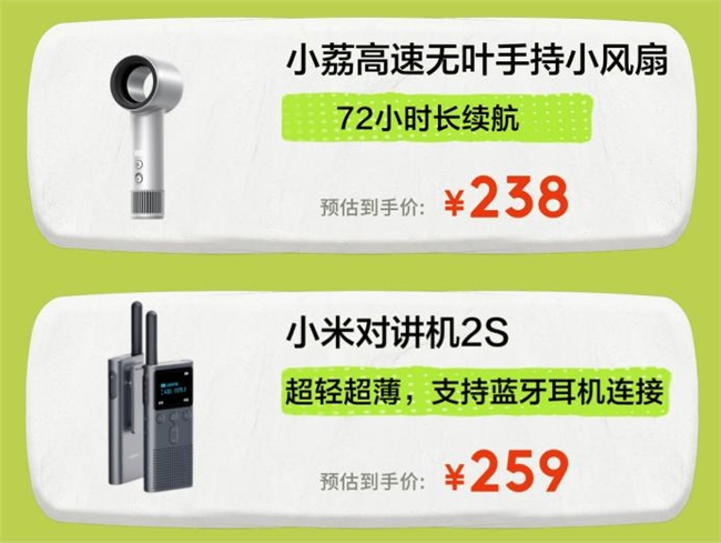 延伸至户外场景,实用便携的智能装备同样能提升出行舒适度与便捷度。小荔高速无叶手持小风扇拥有超长续航能力,无叶设计安全可靠,轻巧机身便于随身携带,72小时长续航,没有充电焦虑,轻松缓解户外闷热感;小米对讲机2S机身轻薄、操作简便,支持蓝牙耳机连接,远距离对讲清晰流畅,成为结伴出游、团队出行的沟通利器,259元让旅途互动更顺畅、出行更安心。