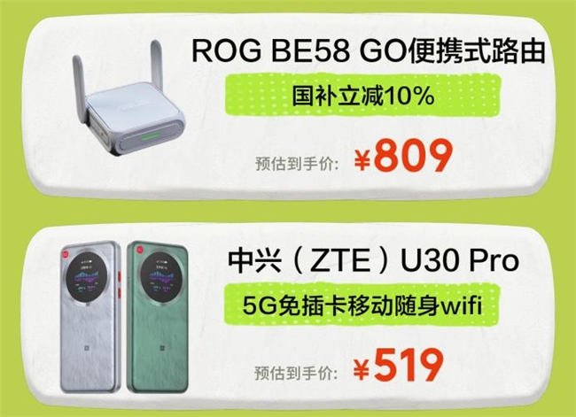 稳定的网络连接,更是休闲娱乐不间断的核心保障。华硕 RT-BE58 GO便携式路由器机身小巧,即开即用,可快速搭建高速网络,多设备连接情况下依旧稳定流畅,能有效解决景区、酒店网络不佳问题,出游季期间享国补立减10%;中兴(ZTE)U30 Pro 5G免插卡随身WiFi无需繁琐设置,户外出行随时随地畅享高速网络,满足追剧、游戏、社交等多元需求,519元轻松实现全程联网无忧,娱乐体验不打折。
