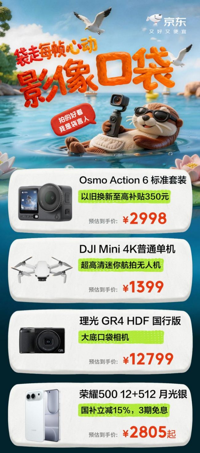 影像拍照方面,无论是硬核运动还是文艺街拍,都有称手之选。大疆Osmo Action 6标准套装以旧换新至高补贴350元,到手仅2998元,在潜水或骑行时凭借超强防抖与裸机防水,稳稳锁定第一视角的冲击力;若想解锁上帝视角,DJI Mini 4K超高清迷你航拍无人机仅1399元就能让新手轻松飞起,轻巧机身塞进口袋,一键拍出草原与海岸的壮阔;追求极致画质的街拍爱好者不可错过理光GR4 HDF国行版,到手价12799元,在城市漫步中就能随手拍出胶片韵味。不想背负额外器材的用户,则可以选择荣耀500 12+512月光银,国补立减15%并享3期免息,到手2805元起,多焦段镜头与AI计算摄影轻松应对美食、夜景与人像,512GB大存储更能存下整趟旅行的记忆。