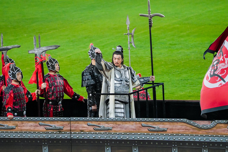 4月18日傍晚,江苏宿迁奥体中心,战鼓如雷、楚旗蔽日。10余匹战马铁蹄踏场,尘土飞扬开路而行。在全场万余名观众的屏息期待中,演员何润东身披乌金霸王甲胄、手持长戟、立于高大战车之上,以《楚汉传奇》中“西楚霸王”项羽的经典造型震撼登场。那一刻,英雄仿佛穿越时空重回故里,整座奥体中心瞬间被震天的欢呼与呐喊声吞没。