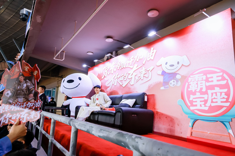 除了巡游助阵,何润东还与现场球迷一同观赛。京东特意为其打造了“霸王宝座”,一款可语音控制、一键躺平的芝华仕智能沙发。不仅如此,京东还为何润东配备了一台百吋大屏电视,霸王宝座配大电视,观赛才够霸气。
