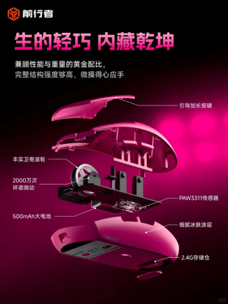 前行者E11系列的竞争力,在于旗舰级传感器+定制主控芯片的硬核组合。E11Pro版本搭载PAW3311光学传感器,支持24000DPI精度与35G加速度,配合定制Freqchp主控芯片,实现双1K回报率(有线/无线均支持1000Hz),指令传输稳定迅疾。在实际测试中E11Pro在《CS2》中快速拉枪时鼠标指针无拖影、无丢帧,精准锁定目标。在《原神》开放世界探索中,精细调整视角时,传感器对微小移动的捕捉极为灵敏,操作流畅自然。E11标准版则采用英斯特S203传感器,12800DPI精度与10G加速度,同样能满足日常游戏与办公需求。环诺蓝壳白点微动开关(2000万次寿命)与丰实卫奇滚轮的组合更确保了按键反馈清脆、滚轮滚动顺滑,耐用性拉满。