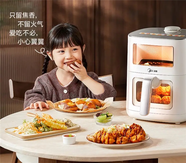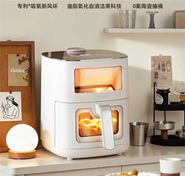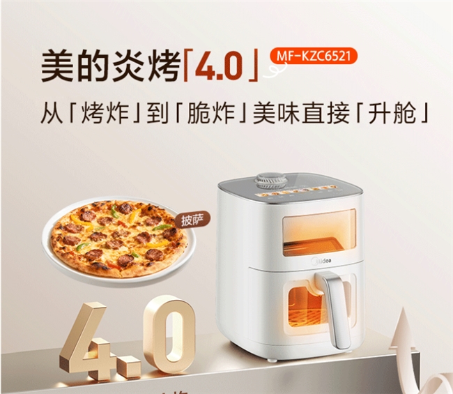 2. 新风排湿+0氟涂层,健康又好吃。给家人做饭,健康永远是第一位的。美的6521采用0氟陶瓷不粘炸桶+全金属内腔,通过多重安全认证,高温下不析出有害物质,没有传统涂层的异味和隐患,家里有宝宝、孕妇也能放心用。而且它的专利新风吸氧环设计,能快速排出食材水汽,避免闷煮导致的干硬发柴,烤出来的食物外酥里嫩,接近油炸口感,却比油炸更健康,少油少盐,既能满足口腹之欲,又不用担心热量超标,平时烤个蔬菜、鸡胸肉,减脂期也能放心吃。