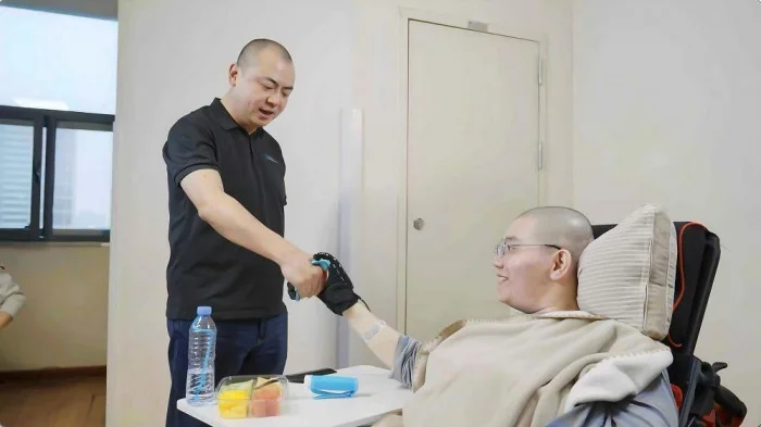 脑虎科技创始人兼首席科学家陶虎(左)与患者(意念控制外骨骼)握手交流