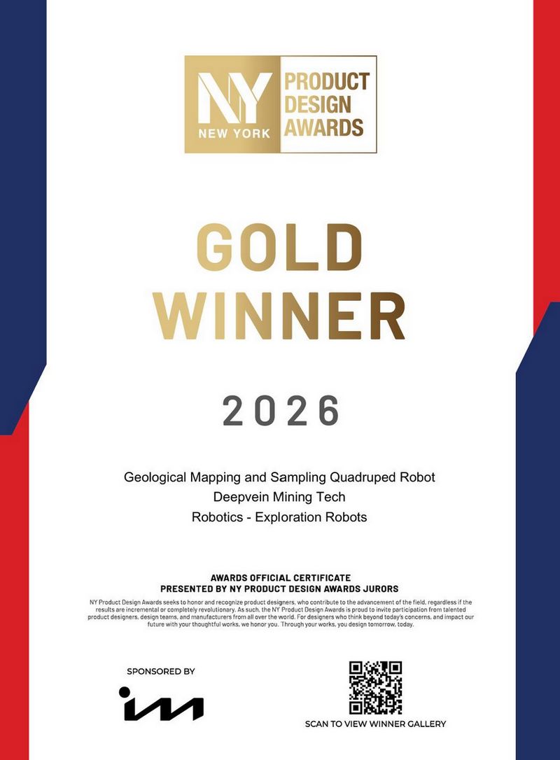 4月,2026年纽约产品设计奖(NY Product Design Awards)揭榜,深脉矿业科技(Deepvein Mining Tech,一家专注矿山具身智能装备的科技公司)旗下“智能地质填图与化学土壤采样机器狗”获金奖。