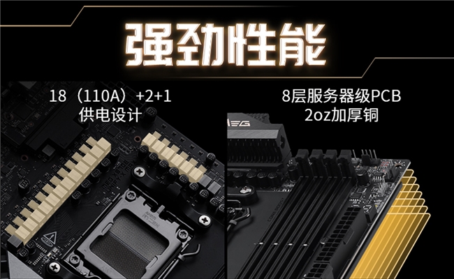 主板采用8层服务器级2oz加厚铜箔PCB,表面覆盖大面积金属散热装甲,质感拉满。此外,主板还配备了全金属背部装甲,在内存槽区域进行特别内凹加固设计,既能大幅提升PCB结构强度与抗变形能力,又能优化电气性能并提供辅助散热效果。