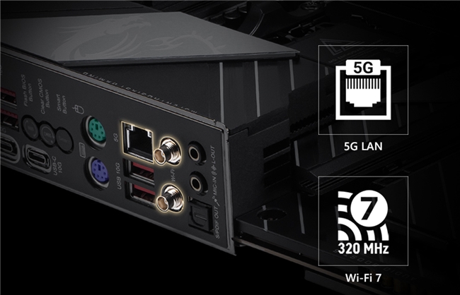 在扩展能力上,暗影-X同样达到了旗舰水准。主板提供4条PCIe插槽(包含PCIe 5.0×16与PCIe 5.0×8)和5个M.2盘位(2个PCIe Gen5×4、3个PCIe Gen4×4)。网络配置上,暗影-X支持5GbE有线网络和Wi-Fi 7无线网络(320MHz频宽),并配备2个USB4 40Gbps接口以及瑞昱ALC4080音频芯片。前置USB-C 20Gbps接口还支持60W PD快充,为移动设备充电提供极大便利。