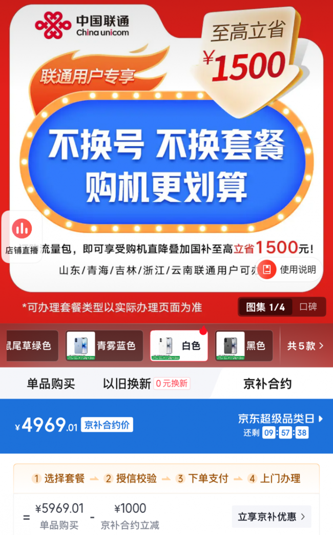 以备受关注的iPhone 17 256GB版本为例,原价5999元,联通用户通过“京补合约”下单立减1000元,到手价仅需4999元;若同时订购流量包,综合优惠至高可达1500元;移动用户通过“京补合约”下单立减300元,到手价5699元。