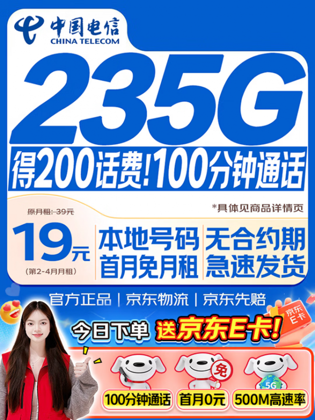 中国电信大流量卡,每月235G流量,月租39元,京东办理首月0元,第2至第4月19元,还可得200元话费,100分钟通话,无隐形消费、可随时销户;中国广电192G套餐,月租39元,京东办理首月0元,第2至第4月仅19元,并加赠30G流量和100分钟通话,满足用户对高速、大流量网络的多样化需求。