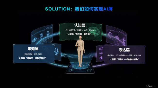 魔珐星云作为“AI屏幕操作系统”的技术架构,构建了覆盖表达层、感知层、认知层的完整技术体系: