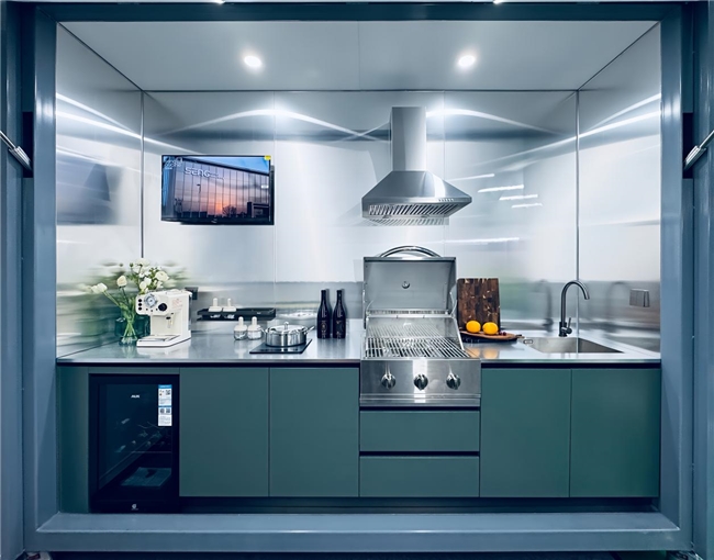 耐用之外,颜值同样能打。它的设计理念很戳人——美学适配自然。意式极简设计,没有多余线条,视觉干净利落,弱化了繁杂感,让厨房自然融入户外环境。松灰绿门板搭配内嵌拉手,低调克制又有高级感,放在院子里丝毫不显突兀,反而像一件为庭院量身定制的艺术品。