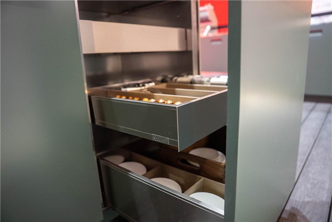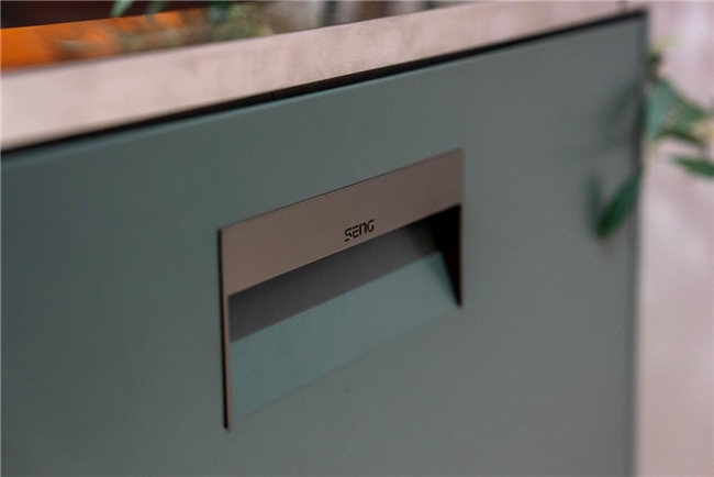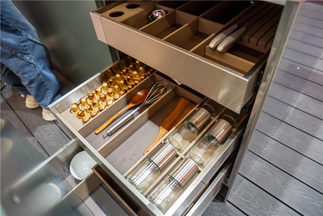 细节也做得相当到位。台面上集成SENG CUCINE圣吉尼自研的多功能组合式沥水系统,洗好的杯子、刀叉随手一放,自然沥干,干净卫生。拉开抽屉,里面是模块式收纳分割件,烧烤夹、叉子、调料瓶各归其位,整整齐齐,治愈强迫症。甚至连不锈钢百叶门镂空设计的柜门都考虑到了,通风透气,柜门常闭也没异味。