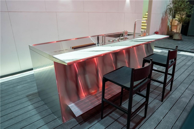 它自然延伸出的吧台形态,一下子拉近了人与人之间的距离。这边在准备水果、清洗餐具,那边朋友已经靠在吧台边喝着啤酒聊着天了。不锈钢台面无缝一体拉伸止水,外观简洁到极致,清洁起来也毫不费劲,用水一冲一抹就干净,简直是懒人福音。
