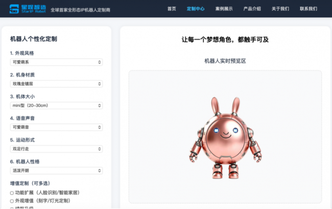 【线上】星娱机器人定制平台:星娱智造即将发布“星娱机器人定制平台”。支持在线设计机器人外观、颜色、机身材质、机体大小、语音声音、运动形式、性格等。