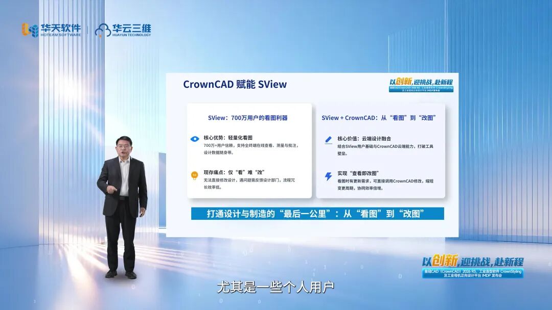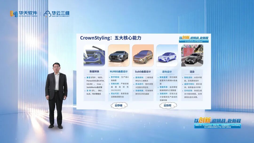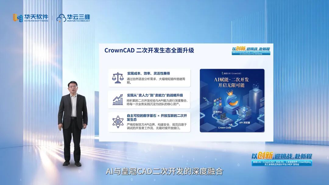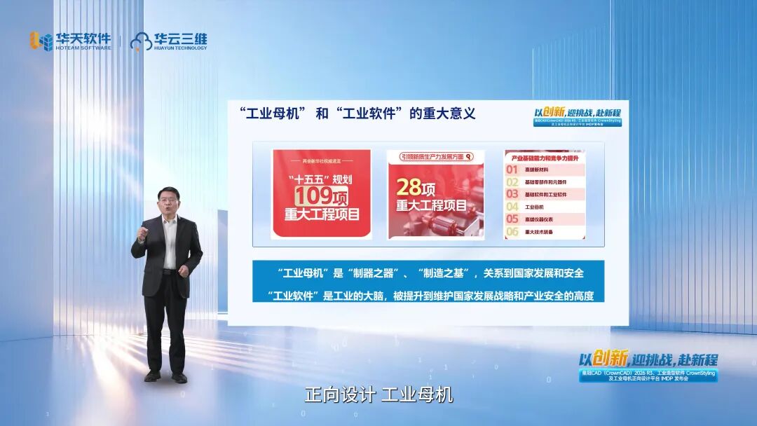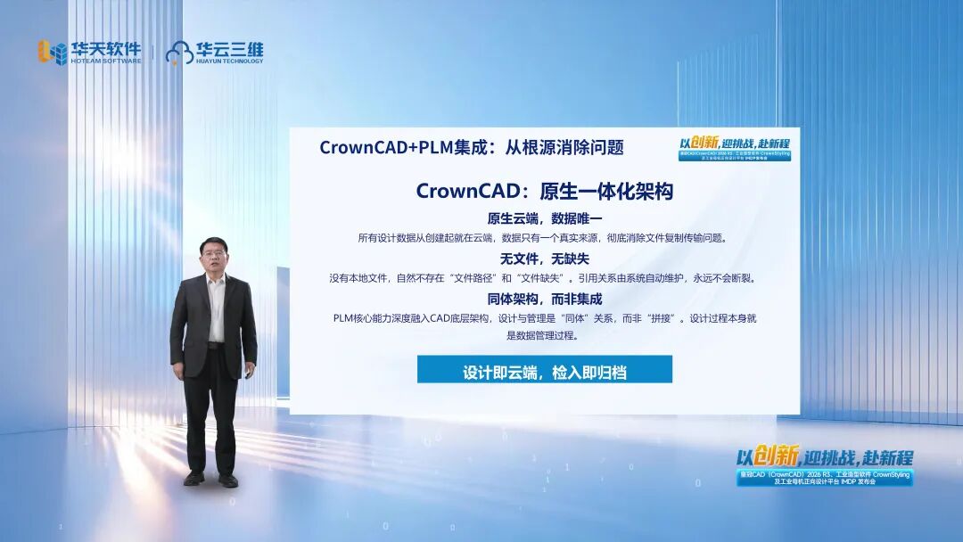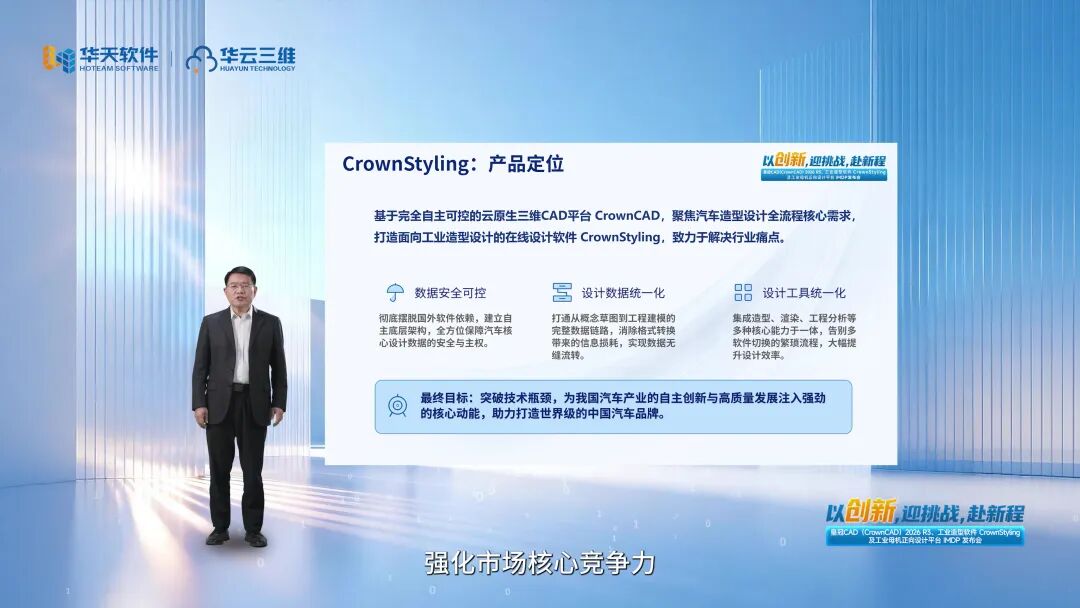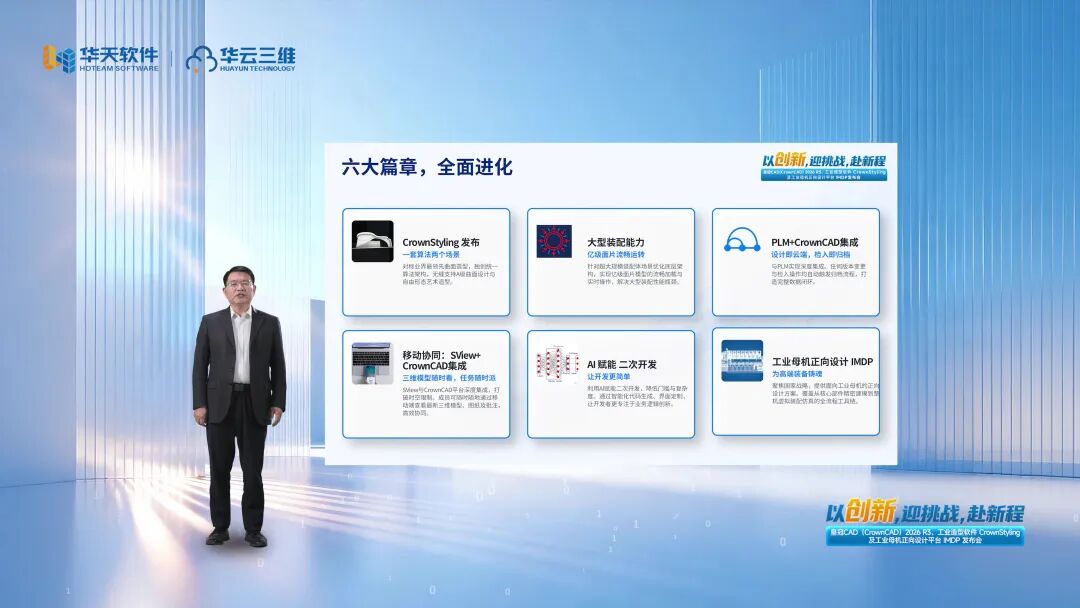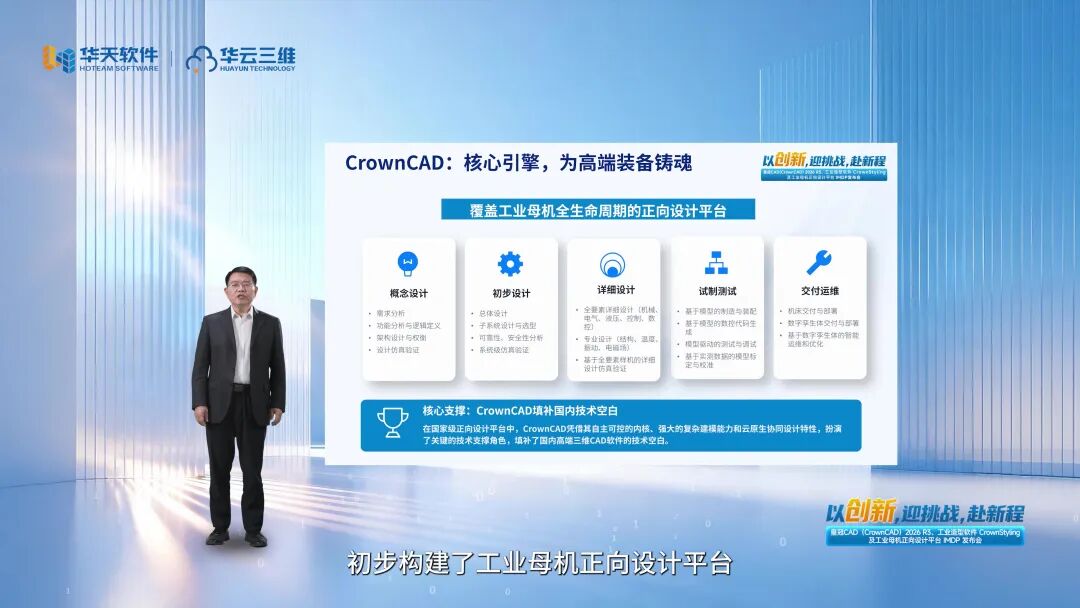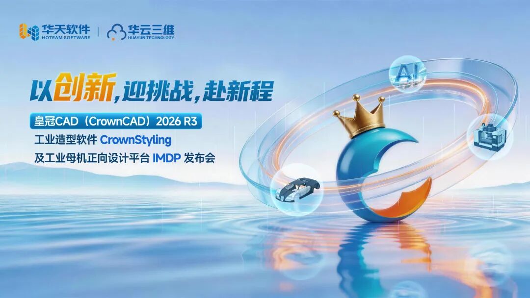 2026年4月28日,华天软件成功举办“皇冠CAD(CrownCAD)2026 R3、工业造型软件CrownStyling及工业母机正向设计平台IMDP发布会”。华天软件首席科学家梅敬成博士作为主讲人,向业界展示了完全自主研发、云原生架构的三维CAD平台——皇冠CAD的最新突破与生态成果。本次发布会以“以创新,迎挑战,赴新程”为主题,重磅推出了面向工业造型软件 CrownStyling 、深度参与共建的工业母机正向设计平台IMDP,以及皇冠CAD 2026 R3版本在六大维度的创新升级。