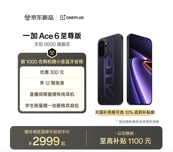 4月28日,一加Ace 6至尊版正式发布,起售价3499元,国补后低至2999元起。京东已同步开售,下单即享以旧换新至高补贴1100元、12期免息等优惠,前1000名购机用户还将获赠小度蓝牙音箱,学生群体还可限量领取一加菱格双肩包。此外,加9.9元还可享受20W移动电源+电池保两年+延长保一年+后盖保一年或一加27W磁吸散热背夹+京东180天意外换新+京东1年延保二选一权益。