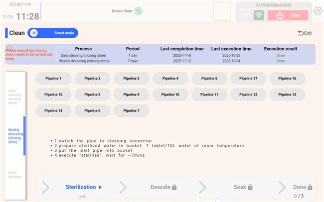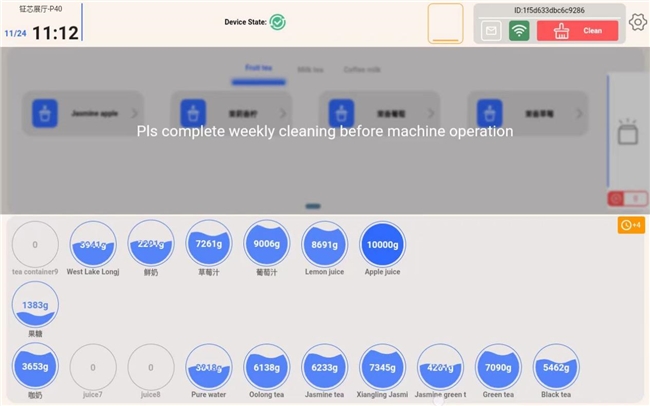 更值得关注的是清洁环节。依托双专利清洁技术加持,钲芯智能奶茶机茶波仕TeaBOX®支持就地清洗(CIP)与就地灭菌(SIP),无需拆卸即可自动进行内部清洗消杀,日清约10分钟、周清约30分钟。设备会自动监控清洁过程,如遇设备不上水、中断或未完成,则会触发报警与锁定。清洁数据留痕并上传SaaS平台,便于总部审查与监管抽查。